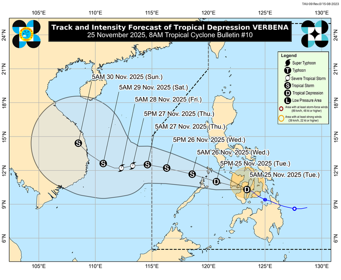 Sáng 25/11, cơ quan khí tượng cho biết, tâm áp thấp nhiệt đới đang ở khu vực miền Trung Philippines. Hệ thống duy trì cường độ gió mạnh quanh tâm, di chuyển theo hướng Tây Tây Bắc với tốc độ khá nhanh và dự kiến sẽ đi vào Biển Đông trong tối hoặc đêm cùng ngày. Khi tiến vào vùng biển phía Đông khu vực giữa Biển Đông, áp thấp nhiệt đới nhiều khả năng mạnh lên thành bão, trở thành cơn bão số 15 trong năm nay.